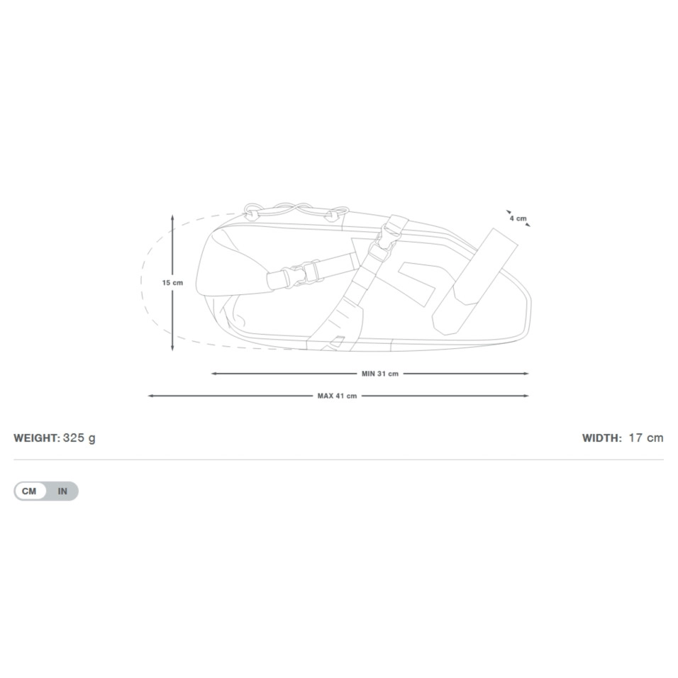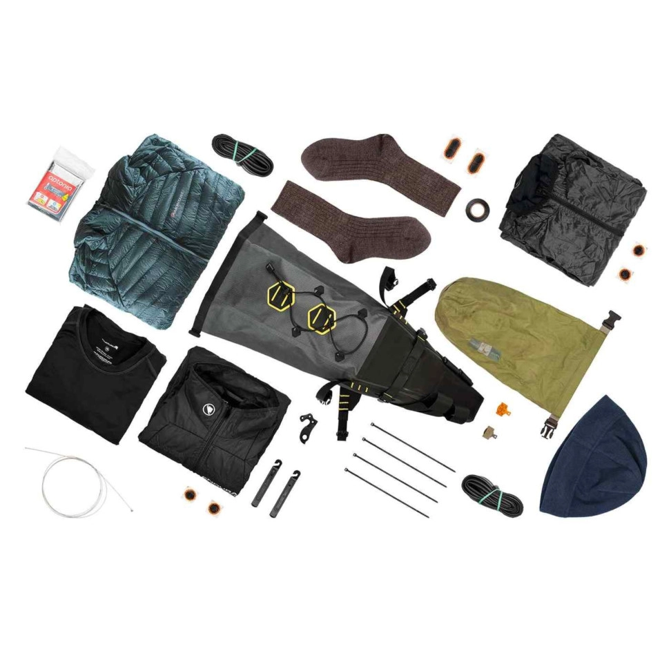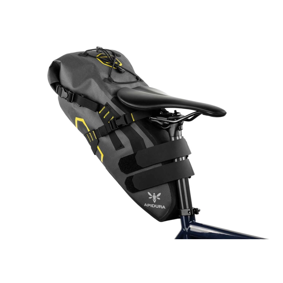Il modello Expedition della marca Apidura è resistente all'acqua, leggero e offre un ampio vano sotto il sellino, eliminando la necessità di un portapacchi posteriore. È progettato per conservare abbigliamento e attrezzatura durante i viaggi a lunga distanza.