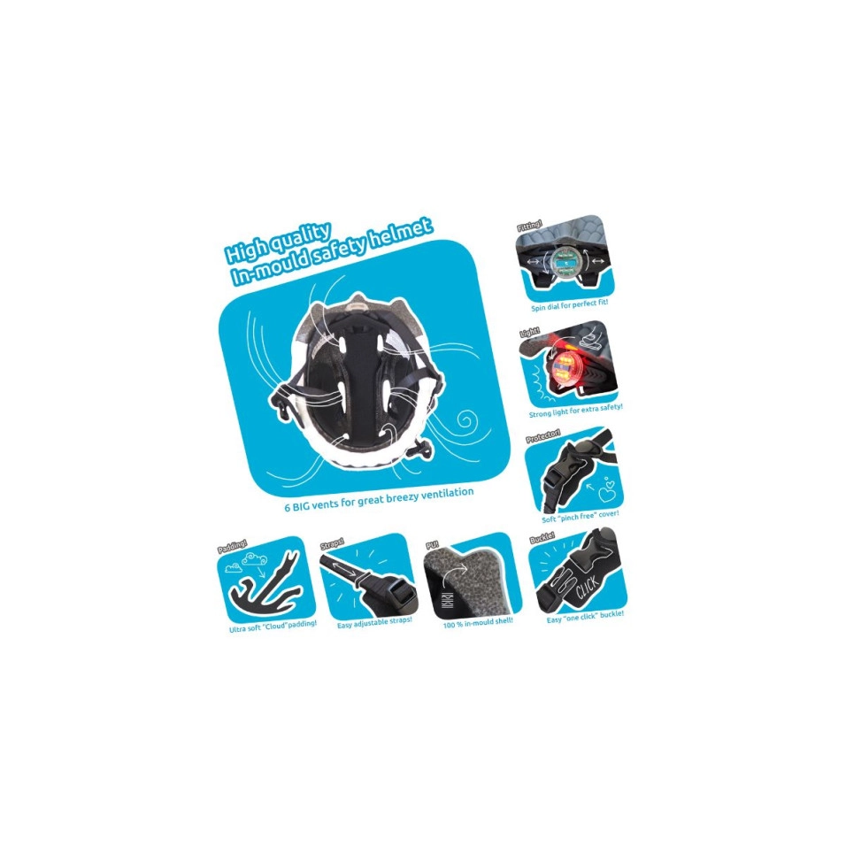 Il Casco Crazy Safety Dinosaurio è adatto ai bambini dai 2 ai 7 anni. Tutti i caschi Crazy Safety sono realizzati con schiuma EPS leggera di alta qualità. Taglia regolabile con il sistema di regolazione interna che modifica la taglia del casco da 49cm a 55cm. La luce LED rossa di sicurezza con 3 funzioni è incorporata nel sistema di regolazione interno con una manopola girevole, e la batteria è facile da sostituire. 6 ampi fori di ventilazione nella parte anteriore, superiore e posteriore garantiscono un buon flusso d'aria. Tutti i caschi Crazy Safety sono dotati di una luce, un'imbottitura protettiva per il mento, cinghie colorate coordinate e imbottiture interne rimovibili e lavabili. Il Casco Crazy Safety Dinosaurio è ideale per andare in bicicletta, monopattino, scooter, bicicletta senza pedali e pattini.