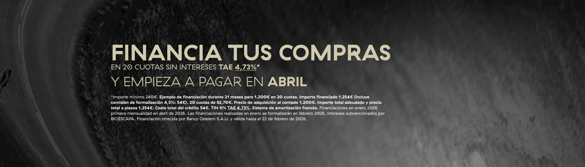 *Importo minimo: 288€. Esempio di finanziamento per un importo di 1.200€ in 24 mesi. Commissione di formalizzazione 4,5%: 54 euro da versare nella prima rata. Prima rata da 104€ e 23 rate da 50€. TIN 0% TAEG 4,53% . Costo totale del credito: 54€. Importo totale dovuto e prezzo totale a rate: € 1.254. Prezzo di acquisto in contanti: € 1.200 . Interessi agevolati da BICIESCAPA. Finanziamento offerto dal Banco Cetelem SAU valido fino al 31/12/2026