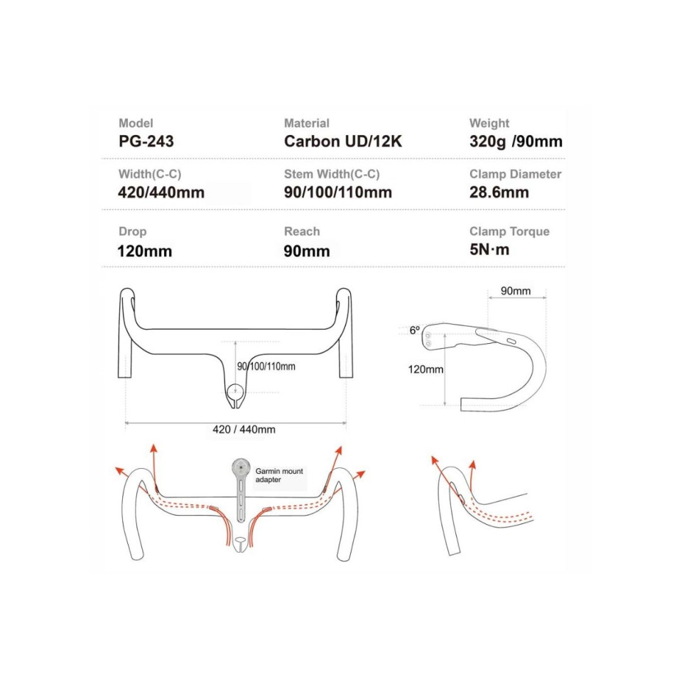 La unidad de potenza e il manubrio in carbonio Progress PG-243 fornisce alla tua bici da strada una migliore aerodinamica, minor torsione e minor peso. Il design H.E.A. offre i massimi vantaggi aerodinamici senza dimenticare un'ottima ergonomia. I 120 mm di caduta e i 90 mm di estensione offrono la regolazione perfetta in tutte le posizioni, una presa sicura e un controllo ottimale della tua bici. Passaggio cavi interno attraverso il manubrio tipo semi-integrato. Con 2 viti inferiori sulla potenza per fissare l'attacco del ciclocomputer. Caratteristiche: Materiale: Fibra di carbonio 12K. Disciplina: Strada. Larghezza: Opzioni di 44cm e 42cm da centro a centro. Lunghezza della potenza: 90mm Angolo della potenza: -6º. Fissaggio della potenza: 1-1/8". Drop: 120mm. Reach: 90mm. Colore: Nero - Rame. Peso: 319 gr (420mm/90mm) Guida cavi: Manubrio interno (Di2). Coppia di serraggio: 5Nm Standard di prova di resistenza: ISO-4210-2 2015 |